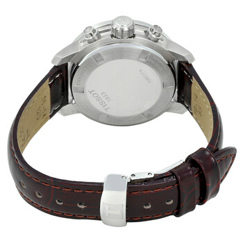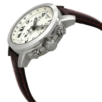 Stainless steel case with a brown leather strap. Fixed stainless steel bezel. Silver dial with luminous grey hands and Roman numeral hour markers. Minute markers. Tachymeter markings around the outer rim. Dial Type: Analog. Luminescent hands. Date display at the 4 o'clock position. Chronograph - three sub-dials displaying: 60 second, 30 minute and 1/10th of a second. Quartz movement. Scratch resistant sapphire crystal. Screw down crown. Solid case back. Case size: 35 mm. Case thickness: 12 mm. Round case shape. Band width: 16 mm. Deployment clasp. Water resistant at 200 meters / 660 feet. Functions: chronograph, tachymeter, date, hour, minute, second. Dress watch style. Watch label: Swiss Made. Item Variations: T055 217 16 033 01, T055-217-16-033-01, T055/217/16/033/01, T0552171603301. Tissot T-Sport Chronograph Silver Dial Ladies Watch T055.217.16.033.01.