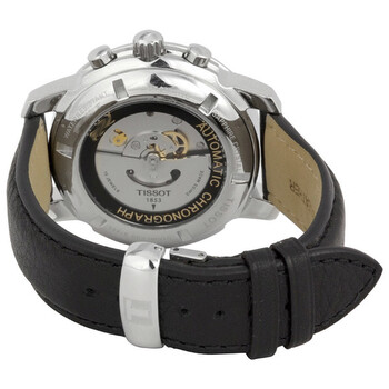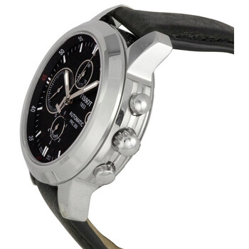 Stainless steel case with a black leather bracelet. Fixed satinless steel bezel. Black dial with luminous hands and stick hour markers. Minute markers around the outer rim. Date display at the 3 o'clock position. Chronograoph - three sub-dials displaying: 60 seconds, 30 minutes and 8 hours. Automatic movement. Scratch resistant sapphire crystal. Textured steel crown. Skeleton case back. Case diameter: 42 mm. Case thickness: 15.84 mm. Tang clasp. Water resistant at 200 meters (660 feet). Functions: hours, minutes, seconds, date, chronograph. Tissot T-Sport PRC200 Automatic Chronograph Men's Watch T014.427.16.051.00.