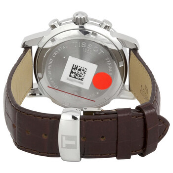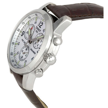 Stainless steel case with a brown croco-embossed leather strap. Fixed stainless steel bezel. Silver dial with luminous silver-tone hands and stick hour markers. Arabic numerals mark the 3, 9 and 12 o'clock positions. Minute markers. Tachymeter scale around the outer rim. Luminescent hands and dial markers. Date displays at the 4 o'clock position. Chronograph - three sub-dials displaying: 60 seconds, 30 minutes and 1/10th of a second. Battery operated quartz movement. Scratch resistant sapphire crystal. Screw down crown. Solid case back. Case diameter: 40 mm. Case thickness: 12 mm. Deployment clasp. Water resistant at 200 meters / 660 feet. Functions: hours, minutes, seconds, date, chronograph, tachymeter. Tissot T-Sport PRC200 Men's Watch T17.1.516.32.
