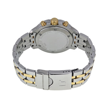 Stainless steel case with a two-tone (silver and gold-tone) stainless steel bracelet. Unidirectional stainless steel bezel. Black dial with luminous gold-tone hands and stick hour markers. Minute markers. tachymeter around the outer rim. Dial Type: Analog. Luminescent hands and markers. Date display at the 4 o'clock position. Chronograph - three sub-dials displaying: 60 seconds, 30 minutes and 1/10th of a second. Quartz movement. Scratch resistant sapphire crystal. Screw down crown. Solid case back. Case diameter: 42 mm. Band width: 11 mm. Deployment clasp. Water resistant at 200 meters / 660 feet. Functions: hours, minutes, seconds, chronograph, tachymeter, date. Tissot T-Sport PRS 200 Chronograph Black Dial Men's Watch T0674172205100.