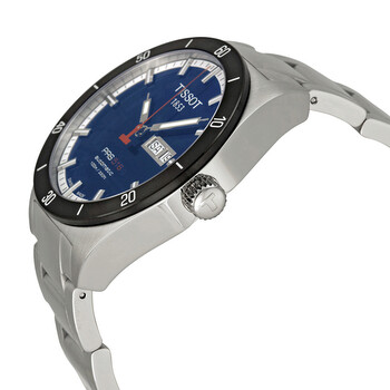 Stainless steel case with a stainless steel bracelet. Black ion-plated bezel. Blue dial with silver-tone hands and index hour markers. Minute markers around the outer rim. Dial Type: Analog. Luminescent hands and markers. Day of the week and date display at the 3 o'clock position. ETA 2836-2 automatic movement with a 40-hour power reserve. Scratch resistant sapphire crystal. Pull / push crown. Skeleton case back. Case size: 42 mm. Case thickness: 11.25 mm. Round case shape. Band width: 20 mm. Band length: 8.5 inches. Deployment clasp. Water resistant at 100 meters / 330 feet. Functions: date, day, hour, minute, second. Sport watch style. Watch label: Swiss made. Item Variations: T0444302104100. Tissot T-Sport PRS516 Automatic Men's Watch T044.430.21.041.00.