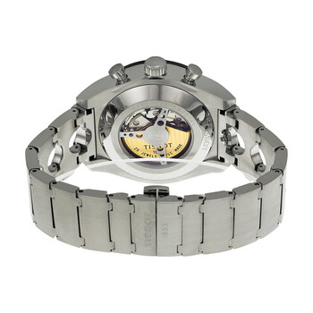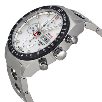 Silver-tone stainless steel case with a silver-tone stainless steel bracelet. Fixed tachymeter scale black ion-plated stainless steel bezel. Silver dial with silver-tone hands and stick hour markers. Minute markers arounfd the outer rim. Dial Type: Analog. Luminescent hands and markers. Day and date display at the 3 o'clock position. Chronograph - three sub-dials displaying: 60 second, 30 minute and 12 hour. ETA-Valjoux Caliber 7750 Automatic movement, containing 25 Jewels, bitting at 28800 vph, and has a power reserve of approximately 44 hours. Scratch resistant sapphire crystal. Exhibition case back. Round case shape, case size: 45 mm, case thickness: 13 mm. Band width: 22 mm, band length: 7.65 inches. Deployment clasp. Water resistant at 100 meters / 330 feet. Functions: chronograph, date, hour, minute, second, tachymeter. Prs 516 Series. Sport watch style. Watch label: Swiss made. Item Variations: T0446142103100. Tissot T-Sport PRS 516 Chronograph Men's Watch T044.614.21.031.00.