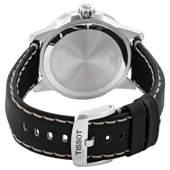 Stainless steel case with a black leather strap. Fixed stainless steel bezel with blue aluminium ring. Blue dial with luminous silver-tone hands and index hour markers. Minute markers around the inner rim. Dial Type: Analog. Luminescent hands and markers. Date display at the 3 o'clock position. ETA caliber F06.115 quartz movement. Scratch resistant sapphire crystal. Solid case back. Round case shape. Case size: 44 mm. Case thickness: 10 mm. Band width: 22 mm. Tang clasp. Water resistant at 100 meters / 330 feet. Functions: date, hour, minute, second, battery eol indicator. T-sport Series. Sport watch style. Watch label: Swiss Made. Tissot T-Sport Quartz Blue Dial Men's Watch T125.610.16.041.00.