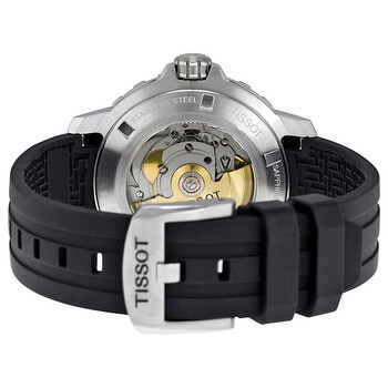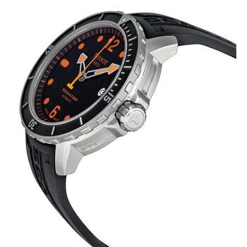 Stainless steel case with a black rubber strap. Black dial with luminous orange hands and dot hour markers. Arabic numerals mark the 6 and 12 o'clock positions. Minute markers around the outer rim. Dial Type: Analog. Luminescent hands and markers. Date display at the 3 o'clock position. Swiss automatic movement. Scratch resistant sapphire crystal. Screw down crown. Skeleton case back. Case diameter: 42 mm. Case thickness: 12.5. Tang clasp. Water resistant at 300 meters / 1000 feet. Functions: hours, minutes, seconds, date. Sport watch style. Tissot Seastar100 Black Dial Automatic Rubber Strap Men's Watch T0664071705701.