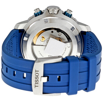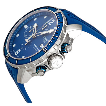 Stainless steel case with a blue rubber strap. Unidirectional blue PVD bezel. Blue dial with silver-tone hands and dot hour markers. Arabic numerals mark the 6 and 12 o'clock positions. Minute markers around the outer rim. Dial Type: Analog. Luminescent hands and markers. Date display at the 3 o'clock position. Swiss automatic movement. Scratch resistant sapphire crystal. Screw down crown. Skeleton case back. Case diameter: 48 mm. Tang clasp. Water resistant at 300 meters / 1000 feet. Functions: hours, minutes, seconds, date. Sport watch style.
