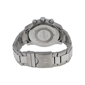 Stainless steel case with a stainless steel bracelet. Fixed stainless steel bezel with a blue ion-plated top ring and showing tachymeter markings. Blue dial with silver-tone hands and index hour markers. Arabic numerals mark the 4, 8 and 12 o'clock positions. Minute markers around the outer rim. Dial Type: Analog. Luminescent hands and markers. Date display at the 3 o'clock position. Chronograph - three sub-dials displaying: 60 second, 30 minute and 1/10th of a second. Quartz movement. Scratch resistant sapphire crystal. Solid case back. Case diameter: 42 mm. Case thickness: 11 mm. Round case shape. Deployment clasp with a push button release. Water resistant at 100 meters / 330 feet. Functions: chronograph, tachymeter, date, hour, minute, second. Casual watch style. Watch label: Swiss Made. Tissot T-sport V8 Blue Dial Stainless Steel Men's Watch T039.417.11.047.02.