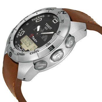 Silver-tone stainless steel case with a tan leather strap. Bi-directional rotating silver-tone stainless steel bezel. Black dial with luminous hands and index hour markers. Dial Type: Analog-digital. Luminescent hands and markers. Perpetual calendar. Chronograph - sub-dials displaying: digital sub-dials. ETA Caliber E48.351 quartz movement. Scratch resistant sapphire crystal. Solid case back. Round case shape, case size: 44 mm, case thickness: 15 mm. Band width: 20 mm. Tang clasp. Water resistant at 100 meters / 330 feet. Functions: perpetual calendar, chronograph, alarm, month, date, day, GMT, second time zone, hour, minute, second, thermometer, altitude indicator, barometer, compass. Casual watch style. Watch label: Swiss Made. Item Variations: T0134201605110. Tissot T-Touch Black Dial Tan Leather Men's Watch T013.420.16.051.10.