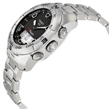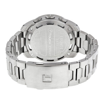 Brushed titanium case with a brushed titanium bracelet. Bidirectional rotating titanim bezel. Black - touch screen dial with luminous hands and index hour markers. Dial Type: Analog-digital. Perpetual calendar. Digital display. ETA caliber E48.351 quartz movement. Scratch resistant tactile sapphire crystal. Solid case back. Case size: 43 mm. Case thickness: 15 mm. Round case shape. Band width: 21 mm. Deployment clasp. Water resistant at 100 meters / 330 feet. Functions: perpetual calendar, chronograph, alarm, month, date, day, GMT, second time zone, hour, minute, second, thermometer, altitude indicator, barometer, compass. Additional Info: touch screen, stop watch, split time. Sport watch style. Watch label: Swiss made. Item Variations: T0134204420100. Tissot T-Touch Expert Brushed Titanium Analog/Digital Men's Watch T013.420.44.201.00.