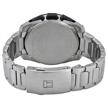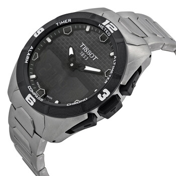Grey titanium case with a grey titanium bracelet. Fixed black PVD titanium bezel. Black dial with luminous hands and index hour markers. Minute markers around the outer rim. Dial Type: Analog-Digital. Luminescent hands and markers. Perpetual calendar. Digital multi-function sub-dial. ETA caliber E84.305 quartz movement. Scratch resistant sapphire crystal. Solid case back. Case size: 45 mm. Case thickness: 13 mm. Round case shape. Butterfly clasp with a push button release. Water resistant at 100 meters / 330 feet. Functions: perpetual calendar, chronograph, world time, alarm, month, date, day, GMT, second time zone, hour, minute, second, thermometer, altitude indicator, barometer, compass, solar-powered. Casual watch style. Watch label: Swiss Made. Item Variations: T091.420.44.051.00. Tissot T-Touch Expert Solar Black Dial Men's Watch T0914204405100.