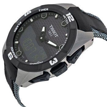 Titanium case with a black leather strap. Fixed black PVD coated titanium bezel. Black (touch screen) dial with luminous hands and index hour markers. Minute markers around the outer rim. Dial Type: Analog-digital. Luminescent hands and markers. Perpetual calendar. Digital multi-function sub-dial. ETA caliber E84.301 quartz movement. Scratch resistant sapphire crystal. Pull / push crown. Solid case back. Case size: 45 mm. Case thickness: 13 mm. Round case shape. Band width: 22.9 mm. Band length: 9 inches. Butterfly clasp. Water resistant at 100 meters / 330 feet. Functions: perpetual calendar, chronograph, world time, alarm, month, date, day, GMT, second time zone, hour, minute, second, thermometer, altitude indicator, barometer, compass. Additional Info: touch screen, stop watch, split time. Casual watch style. Watch label: Swiss Made. Item Variations: T091.420.46.051.01. Tissot T-Touch Expert Solar Men's Watch T0914204605101.
