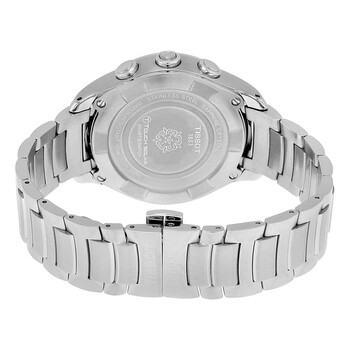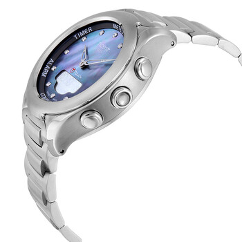 Stainless steel case with a stainless steel bracelet. Fixed stainless steel bezel. Black mother of pearl dial with silver-tone skeleton alpha-style shape hands and diamond hour markers. Functions listed around the outer rim. Dial Type: Analog-digital. Perpetual calendar. Digital sub-dial. ETA caliber E81.301 quartz movement. Scratch resistant sapphire crystal. Solid case back. Round case shape. Case size: 38 mm. Case thickness: 12.14 mm. Band width: 18 mm. Fold over clasp. Water resistant at 100 meters / 330 feet. Functions: perpetual calendar, chronograph, alarm, month, date, day, second time zone, hour, minute, second, battery eol indicator, thermometer, altitude indicator, barometer, compass. Sport watch style. Watch label: Swiss Made. Tissot T-Touch Expert Solar Perpetual Alarm Chronograph Diamond Ladies Watch T075.220.11.106.01.