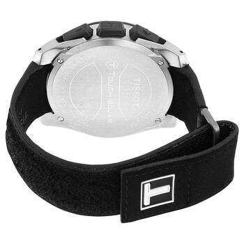 Grey titanium case with a black leather strap. Fixed black PVD titanium bezel. Black dial with luminous black white hands and index hour markers. Minute markers around the outer rim. Dial Type: Analog-digital. Luminescent hands. Perpetual calendar. Chronograph - sub-dials displaying: digital. ETA Caliber E84.301 quartz movement. Scratch resistant tactile sapphire crystal. Solid case back. Round case shape, case size: 45 mm, case thickness: 13 mm. Band width: 22 mm. Tang clasp. Water resistant at 100 meters / 330 feet. Functions: perpetual calendar, chronograph, world time, alarm, month, date, day, GMT, second time zone, hour, minute, second, altitude indicator, barometer, compass. Additional Info: touch screen, stop watch, split time. T-touch Expert Solar Series. Sport watch style. Watch label: Swiss Made. Tissot T-Touch Expert Solar Perpetual Alarm World Time Chronograph Quartz Analog-Digital Black Dial Men's Watch T091.420.46.041.00.