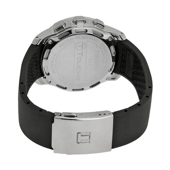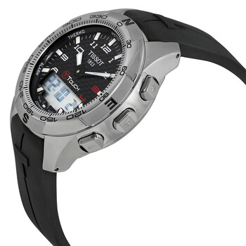 Titanium case with a black rubber strap. Fixed titanium bezel. Black digital / Analog dial with luminous hands and Arabic numeral / index hour markers. Minute markers. Dial Type: Analog-digital. Luminescent hands and markers. Perpetual calendar. Digital sub-dial. ETA caliber E48.311 quartz movement. Scratch resistant sapphire crystal. Solid case back. Round case shape. Case size: 42 mm. Case thickness: 13 mm. Deployment clasp with a push button release. Water resistant at 100 meters / 330 feet. Functions: perpetual calendar, chronograph, world time, alarm, date, day, GMT, second time zone, hour, minute, second, battery eol indicator, thermometer, altitude indicator, compass. Additional Info: digital chronograph, altimeter, barometer, thermometer and compass. Sport watch style. Watch label: Swiss made. Item Variations: T0474204720700. Tissot T-Touch II Analog Digital Men's Watch T047.420.47.207.00.