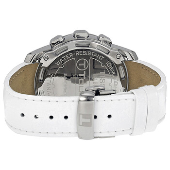 Titanium case with a white leather strap. Bi-directional rotating titanium bezel. Silver dial with luminous black hands and diamond and index hour markers. Minute markers around the outer rim. Dial Type: Analog-digital. Luminescent hands. Perpetual calendar. Digital sub-dial. ETA caliber E48.311 quartz movement. Scratch resistant sapphire crystal. Pull / push crown. Solid case back. Round case shape. Case size: 43 mm. Case thickness: 14.6 mm. Band width: 21 mm. Band length: 7.5 inches. Deployment clasp with a push button release. Water resistant at 100 meters / 330 feet. Functions: chronograph, hour, minute, second. Additional Info: thermometer, alarm, compass, altimeter and barometer functions. Sport watch style. Watch label: Swiss Made. Item Variations: T0472204608600. Tissot T-Touch II Multi-Function Silver Dial Titanium Watch T047.220.46.086.00.