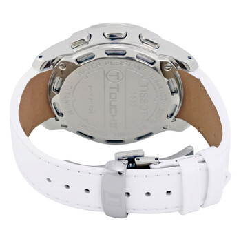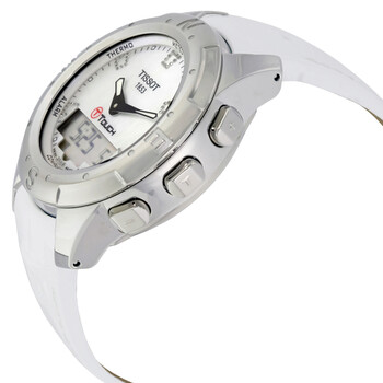 Titanium case with a white leather strap. Fixed titanium bezel. Mother of pearl dial with luminous black hands and diamond index markers at the even hour positions hour markers. Minute markers around the outer rim. Dial Type: Analog-digital. Luminescent hands. Date display at the 6 o'clock position. Digital sub-dial. ETA caliber E48.311 quartz movement. Scratch resistant sapphire crystal. Solid case back. Case size: 43 mm. Case thickness: 14.6 mm. Round case shape. Strap thickness: 17.8 mm. Butterfly clasp. Water resistant at 100 meters / 330 feet. Functions: perpetual calendar, chronograph, world time, alarm, date, day, GMT, second time zone, hour, minute, second, battery eol indicator, thermometer, altitude indicator, compass. Casual watch style. Watch label: Swiss Made. Tissot T-Touch II White Mother of Pearl Ladies Watch T0472204611600.