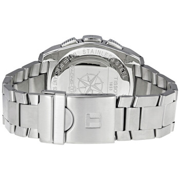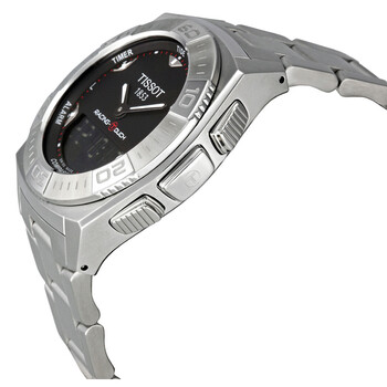Stainless steel case with a stainless steel bracelet. Fixed stainless steel bezel. Black dial with luminous hands and index hour markers. Minute markers. Dial Type: Analog-digital. Perpetual calendar. Digital display. ETA Caliber E49.301 quartz movement. Scratch resistant sapphire crystal. Solid case back. Case size: 43 mm. Case thickness: 15.5 mm. Round case shape. Deployment clasp. Water resistant at 100 meters / 330 feet. Functions: perpetual calendar, chronograph, world time, alarm, month, date, day, GMT, second time zone, hour, minute, second, thermometer, altitude indicator, barometer, compass, tide indicator. Additional Info: touch screen, stop watch, split time. Casual watch style. Watch label: Swiss Made. Tissot T-Touch Racing Stainless Steel Men's Watch T002.520.11.051.00.