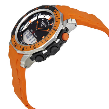 Stainless steel case with a orange rubber strap. Fixed orange and black ion-plated bezel. Black dial with luminous orange hands and stick hour markers. Minute markers around the outer rim. Dial Type: Analog-digital. Luminescent hands and markers. Digital. Digital display subdials. Quartz movement. Scratch resistant sapphire crystal. Solid case back. Case size: 44.4 mm. Case thickness: 15.8 mm. Dodecagon case shape. Tang clasp. Water resistant at 100 meters / 330 feet. Functions: alarm, comass, dive, chronograph, thermometer, logbook, date, month, year, hour, minute, second. Additional Info: chronograph, compass, depth-measurement, dual-time-display, stop-watch. Sport watch style. Watch label: Swiss Made. Item Variations: T0264201728102. Tissot T-Touch Sea-Touch Men's Watch T026.420.17.281.02.