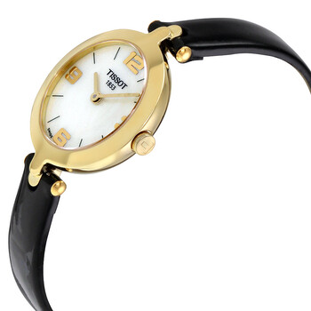 Gold-tone stainless steel case with a black leather strap. Fixed gold-tone bezel. Mother of pearl dial with gold-tone hands and index hour markers. Arabic numerals mark the 3, 6, 9 and 12 o'clock positions. Dial Type: Analog. Quartz movement. Scratch resistant sapphire crystal. Pull / push crown. Solid case back. Case diameter: 27 mm. Case thickness: 7 mm. Round case shape. Tang clasp. Water resistant at 30 meters / 100 feet. Functions: hour, minute. Dress watch style. Tissot T-Trend Flamingo Mother of Pearl Dial Black Leather Ladies Watch T003.209.36.117.00.