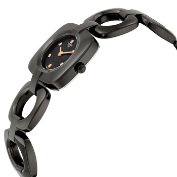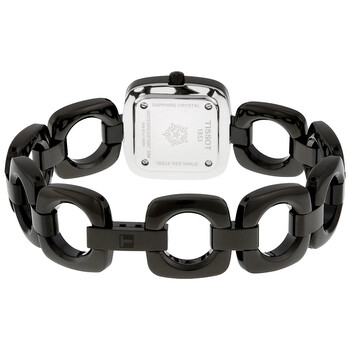 Black PVD stainless steel case and bracelet. Fixed black PVD bezel. Black dial with gold-tone hands. Index markers at the 2, 4, 6. 8, 10 and 12 o'clock positions. Dial Type: Analog. Quartz movement. Scratch resistant sapphire crystal. Pull / push crown. Solid case back. Case diameter: 27 mm. Case thickness: 8 mm. Cushion case shape. Band width: 19 mm. Jewelry clasp. Water resistant at 30 meters / 100 feet. Functions: hour, minute. Casual watch style. Watch label: Swiss made. Item Variations: T0201091105100. Tissot T-Trend Odaci-T Black Dial Black PVD Ladies Watch T0201091105100.
