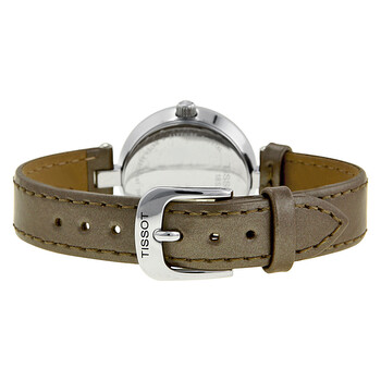 Stainless steel case with a brown leather strap. Fixed stainless steel bezel. White dial with silver-tone hands. An Arabic numeral marks the 12 o'clock position. Dot markers appear at the 3, 6 and 9 o'clock positions. Dial Type: Analog. Date display at the 3 o'clock position. ETA caliber F04.111 quartz movement. Scratch resistant sapphire crystal. Pull / push crown. Solid case back. Round case shape. Case size: 27.95 mm. Case thickness: 6.9 mm. Band width: 12 mm. Tang clasp. Water resistant at 30 meters / 100 feet. Functions: date, hour, minute, second. Casual watch style. Watch label: Swiss Made. Tissot T-Trend Pinky White Dial Ladies Watch T0842101601701.