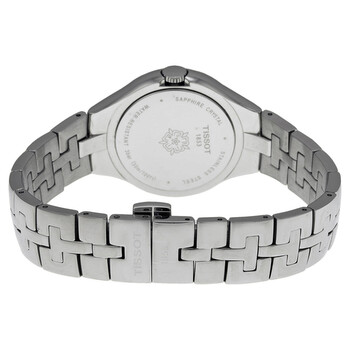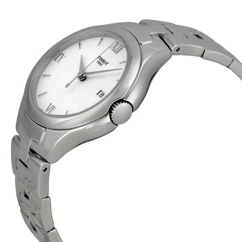 Stainless steel case with a stainless steel bracelet. Fixed stainless steel bezel. Silver dial with silver-tone hands and index hour markers. Roman numerals mark the 3, 6, 9 and 12 o'clock positions. Dial Type: Analog. Date display at the 3 o'clock position. ETA caliber F04.111 quartz movement. Scratch resistant sapphire crystal. Pull / push crown. Solid case back. Round case shape. Case size: 34 mm. Case thickness: 8.56 mm. Band width: 16 mm. Band length: 7.5 inches. Butterfly clasp. Water resistant at 30 meters / 100 feet. Functions: date, hour, minute, second. Casual watch style. Watch label: Swiss Made. Tissot T-Trend Silver Dial Stainless Steel Ladies Watch T0822101103800.