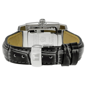 Stainless steel case with a black leather strap. Fixed stainless steel bezel. Mother of pearl dial with silver-tone hands and alternating Arabic numeral and diamond hour markers. Dial Type: Analog. Quartz movement. Scratch resistant sapphire crystal. Solid case back. Case dimensions: 31.2 mm x 25.4 mm. Case thickness: 7.35 mm. Rectangle case shape. Deployment clasp with push button. Water resistant at 30 meters / 100 feet. Functions: hour, minute, second. Dress watch style. Watch label: Swiss Made. Tissot T-Trend T10 Diamond Mother of Pearl Stainless Steel Ladies Watch T073.310.16.116.00.