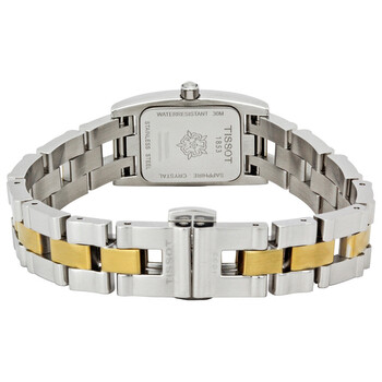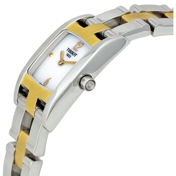 Stainless steel case with a two-tone (silver-tone and gold-tone) stainless steel bracelet. Fixed two-tone (silver-tone and gold-tone) bezel. Mother of pearl dial with gold-tone hands. Arabic numerals appear at the 6 and 12 o'clock positions. Dot markers appear at the 3 and 9 o'clock positions. Dial Type: Analog. ETA caliber 280.002 quartz movement. Scratch resistant sapphire crystal. Clear cabochon crown. Solid case back. Rectangle case shape. Case size: 18 mm. Case thickness: 7 mm. Deployment clasp. Water resistant at 100 meters / 330 feet. Functions: hour, minute. T-trend Collection Series. Casual watch style. Watch label: Swiss Made. Item Variations: T0421092211700. Tissot T-Trend T3 Mother of Pearl Dial Ladies Watch T042.109.22.117.00.
