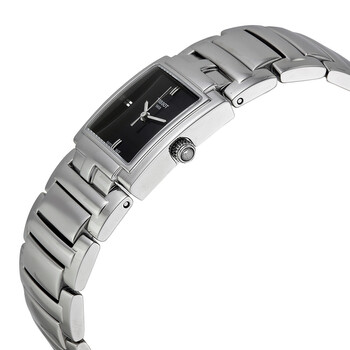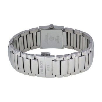Stainless steel case with a stainless steel bracelet. Fixed stainless steel bezel. Black dial with silver-tone hands. Index markers at the 3, 6, 9 and 12 o'clock positions. The Tissot name appears below the 12 o'clock position. Dial Type: Analog. Quartz movement. Scratch resistant sapphire crystal. Pull / push crown. Solid case back. Case size: 23 mm. Case thickness: 7 mm. Square case shape. Band width: 23 mm. Invisible double locking clasp. Water resistant at 100 meters / 330 feet. Functions: hours, minutes, seconds. Casual watch style. Watch label: Swiss Made. Item Variations: T051 310 11 051 00, T051-310-11-051-00, T051/310/11/051/00, T0513101105100. Tissot T-Trend T-Evocation Ladies Watch T0513101105100.
