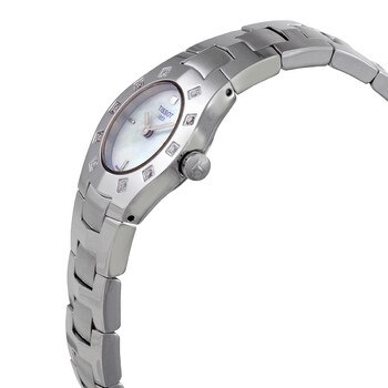 Stainless steel case with a stainless steel bracelet. Fixed stainless steel set with diamonds bezel. White mother-of-pearl dial with silver-tone hands. Index markers appear at the 3, 6, 9 and 12 o'clock positions. Dial Type: Analog. Quartz movement. Scratch resistant sapphire crystal. Pull / push crown. Solid case back. Round case shape. Case size: 23 mm. Case thickness: 6 mm. Band width: 13 mm. Hidden push button deployment clasp. Water resistant at 30 meters / 100 feet. Functions: hour, minute. T-round Series. Dress watch style. Watch label: Swiss made. Item Variations: T64168581. Tissot T-Trend T-Round Diamond Mother of Pearl Dial Ladies Watch T64.1.685.81.