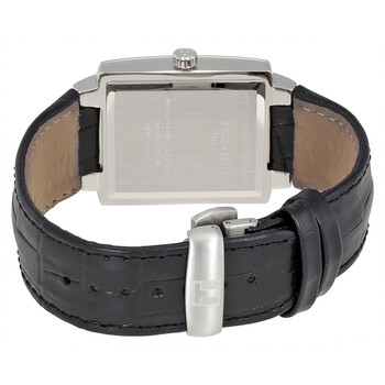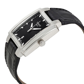 Stainless steel case with a black leather strap. Fixed stainless steel bezel. Black dial with luminous silver-tone hands and index hour markers. Minute markers around the outer rim. Dial Type: Analog. Luminescent hands and markers. Date display at the 6 o'clock position. ETA caliber F05.111 quartz movement. Scratch resistant sapphire crystal. Solid case back. Case dimensions: 31 mm x 35 mm, case thickness: 9 mm. Rectangle case shape. Band width: 20 mm. Butterfly clasp. Water resistant at 100 meters / 330 feet. Functions: date, hour, minute, second. Casual watch style. Watch label: Swiss Made. Item Variations: T061 510 16 051 00, T061-510-16-051-00, T061/510/16/051/00, T0615101605100. Tissot T-Trend TXL Black Dial Men's Watch T0615101605100.