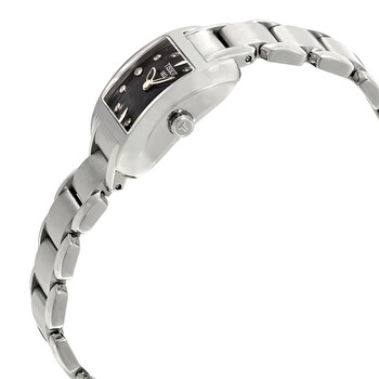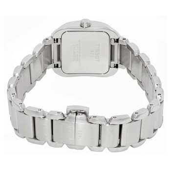 Stainless steel case with a stainless steel bracelet. Fixed stainless steel bezel. Black dial with luminous skeleton hands and diamond hour markers. Index markers at the 3, 6, 9 and 12 o'clock positions. Dial Type: Analog. ETA caliber 901.001 quartz movement. Scratch resistant sapphire crystal. Pull / push crown. Solid case back. Square case shape. Case dimensions: 23 mm x 20 mm. Case thickness: 7 mm. Band width: 12 mm. Deployment clasp. Water resistant at 30 meters / 100 feet. Functions: hour, minute. Additional Info: withstands rain and splashes of water, but not showering or submersion. Fashion watch style. Watch label: Swiss made. Item Variations: T02128554. Tissot T-Wave Black Dial Ladies Watch T02.1.285.54.