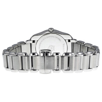 Stainless steel case with a stainless steel bracelet. Fixed stainless steel bezel. Black dial with silver-tone skeleton hands and diamond hour markers. Index markers at the 3, 6, 9, and 12 o'clock position. Dial Type: Analog. ETA caliber F03.111 quartz movement. Scratch resistant sapphire crystal. Pull / push crown. Solid case back. Round case shape. Case dimensions: 28 mm x 26 mm. Case thickness: 7.95 mm. Band width: 15 mm. Butterfly clasp. Water resistant at 30 meters / 100 feet. Functions: hour, minute, second. Casual watch style. Watch label: Swiss Made. Item Variations: T0232101105600. Tissot T-Wave Black Dial Ladies Watch T023.210.11.056.00.