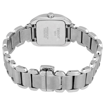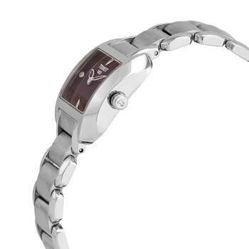 Stainless steel case with a stainless steel bracelet. Fixed stainless steel bezel. Brown dial with silver-tone hands. Index markers at the 3, 6, 9 and 12 o'clock positions. Dial Type: Analog. ETA caliber 901.001 quartz movement. Scratch resistant sapphire crystal. Pull / push crown. Solid case back. Square case shape. Case size: 24 mm. Case thickness: 7.2 mm. Band width: 14 mm. Deployment with push button release clasp. Water resistant at 30 meters / 100 feet. Functions: hour, minute. T-wave Series. Casual watch style. Watch label: Swiss Made. Tissot T-Wave Brown Dial Stainless Steel Ladies Watch T02.1.285.61.