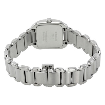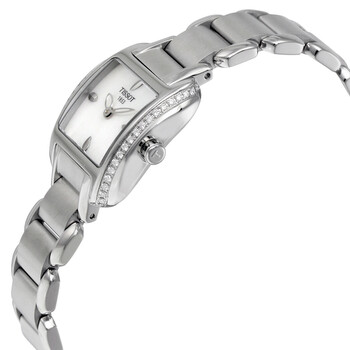 Stainless steel case with a stainless steel bracelet. Fixed stainless steel bezel set with diamonds. Mother of pearl dial with silver-tone hands. Index markers appear at the 3, 6, 9 and 12 o'clock positions. Quartz movement. Scratch resistant synthetic sapphire crystal. Pull / push crown. Solid case back. Case diameter: 23 mm. Case thickness: 7 mm. Square case shape. Band width: 14 mm. Deployment clasp. Water resistant at 30 meters / 100 feet. Functions: hour, minute. Additional Info: withstands rain and splashes of water, but not showering or submersion. Casual watch style. Watch label: Swiss made. Item Variations: T02138571. Tissot T-Wave Mother of Pearl Dial Stainless Steel Ladies Watch T02.1.385.71.