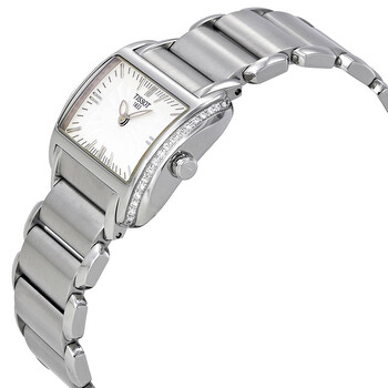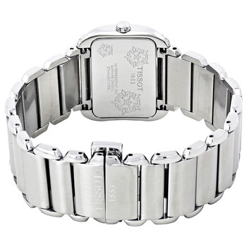 . Stainless steel case with a stainless steel bracelet. Fixed stainless steelbezel set with 40 diamonds. Silver dial with luminous silver-tone hands and index hour markers. Minute markers around the outer rim. Dial Type: Analog. Luminescent hands and markers. ETA caliber 901.005 quartz movement. Scratch resistant sapphire crystal. Pull / push crown. Transparent case back. Rectangle case shape. Case dimensions: 31.6 mm x 20.2 mm. Case thickness: 7.2 mm. Band width: 22 mm. Deployment clasp. Water resistant at 30 meters / 100 feet. Functions: hour, minute. Sport watch style. Watch label: Swiss made. Item Variations: T0233091103101. Tissot T-Wave Stainless Steel Diamond Ladies Watch T023.309.11.031.01.