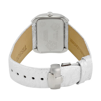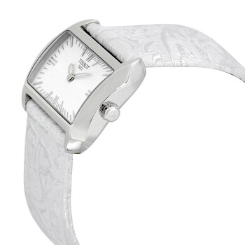 Stainless steel case with a silver leather strap. Fixed stainless steel bezel. White dial with silver-tone skeleton hands and index hour markers. Minute markers around the outer rim. Dial Type: Analog. ETA Caliber 901.005 quartz movement. Scratch resistant synthetic sapphire crystal. Pull / push crown. Solid case back. Rectangle case shape. Case dimensions: 31.6 mm x 20.2 mm. Case thickness: 8 mm. Band width: 22 mm. Band length: 6.75 inches. Deployment clasp. Water resistant at 30 meters / 100 feet. Functions: hour, minute. Casual watch style. Watch label: Swiss made. Item Variations: T0233091603102. Tissot T-Wave White Dial Silver Leather Ladies Watch T0233091603102.
