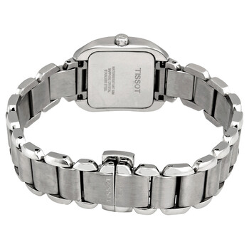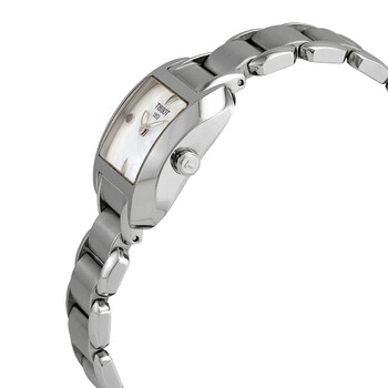 Stainless steel case with a stainless steel bracelet. Fixed stainless steel bezel. White mother of pearl dial with silver-tone hands. Index markers at the 3, 6, 9 and 12 o'clock positions. Dial Type: Analog. ETA caliber 901.001 quartz movement. Scratch resistant sapphire crystal. Pull / push crown. Solid case back. Square case shape. Case size: 24 mm. Case thickness: 7.2 mm. Band width: 14 mm. Deployment clasp. Water resistant at 30 meters / 100 feet. Functions: hour, minute. T-wave Series. Casual watch style. Watch label: Swiss Made. Tissot T-Wave White Dial Stainless Steel Ladies Watch T02.1.285.71.
