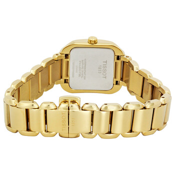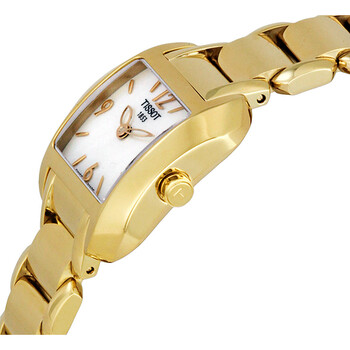 18kt gold PVD stainless steel case and bracelet. Fixed 18kt gold PVD bezel. White mother of pearl dial with gold-tone skeletal hands and index hour markers. Arabic numerals mark the 3, 6, 9 and 12 o'clock positions. Dial Type: Analog. Luminescent hands and dial markers. ETA 901.005 quartz movement. Scratch resistant sapphire crystal. Screw down crown. Solid case back. Case size: 25 mm. Case thickness: 9 mm. Square case shape. Band width: 15.2 mm. Band length: 6 inches. Deployment clasp with a push button release. Water resistant at 30 meters / 100 feet. Functions: hour, minute. Dress watch style. Watch label: Swiss made. Item Variations: T02528582. Tissot T-Wave White Mother of Pearl Dial Gold PVD Ladies Watch T02.5.285.82.