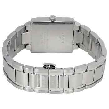 Stainless steel case with astainless steel bracelet. Fixed stainless steel bezel. Black dial with luminous silver-tone hands and index hour markers. Minute markers around the outer rim. Dial Type: Analog. Luminescent hands. Date display above the 6 o'clock position. ETA caliber F05.111 quartz movement. Scratch resistant sapphire crystal. Solid case back. Rectangle case shape. Case dimensions: 32 mm x 29 mm. Case thickness: 8 mm. Band width: 18 mm. Fold over clasp. Water resistant at 100 meters / 330 feet. Functions: date, hour, minute, second. Casual watch style. Watch label: Swiss Made. Item Variations: T061 310 11 05 100, T061-310-11-05-100, T061/310/11/05/100, T0613101105100. Tissot TXL Black Dial Ladies Watch T0613101105100.