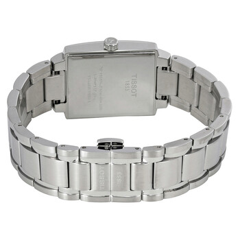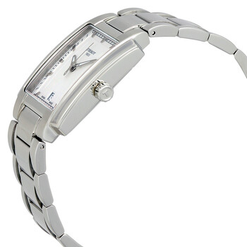 Stainless steel case with a stainless steel bracelet. Fixed stainless steel bezel. Silver dial with luminous silver-tone hands and index hour markers. Minute markers around the outer rim. Dial Type: Analog. Luminescent hands. Date display at the 6 o'clock position. ETA caliber F05.111 quartz movement. Scratch resistant sapphire crystal. Solid case back. Rectangle case shape. Case dimensions: 32 mm x 29 mm. Case thickness: 8 mm. Band width: 20 mm. Fold over clasp. Water resistant at 100 meters / 330 feet. Functions: date, hour, minute, second. Additional Info: in general, suitable for swimming and snorkeling, but not diving. Casual watch style. Watch label: Swiss Made. Item Variations: T0613101103100. Tissot TXL Silver Dial Ladies Watch T061.310.11.031.00.