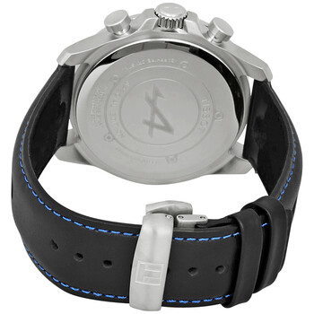 Stainless steel case with a black (calfskin) leather strap. Fixed stainless steel bezel with a blue top ring showing tachymeter markings. Black carbon dial with luminous grey hands and index hour markers. Minute markers around the outer rim. Dial Type: Analog. Luminescent hands and markers. Date display at the 6 o'clock position. Chronograph - three sub-dials displaying: 60 second, 30 minute and 1/10th of a second. Quartz movement. Scratch resistant sapphire crystal. Solid case back. Round case shape. Case size: 42.5 mm. Case thickness: 11.2 mm. Band width: 22 mm. Butterfly clasp. Water resistant at 100 meters / 330 feet. Functions: chronograph, tachymeter, date, hour, minute, second. Sport watch style. Watch label: Swiss Made. Tissot V8 Alpine Chronograph Black Dial Men's Watch T106.417.16.201.01.