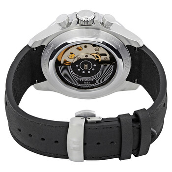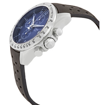 Stainless steel case with a black leather strap. Fixed stainless steel bezel showing tachymeter markings. Blue dial with luminous silver-tone hands and Arabic numeral hour markers. Minute markers around the outer rim. Dial Type: Analog. Luminescent hands. Date display at the 3 o'clock position. Chronograph - three sub-dials displaying: 60 second, 30 minute and 6 hour. ETA caliber C01.211 automatic movement with a 45-hour power reserve. Scratch resistant sapphire crystal. Transparent case back. Round case shape. Case size: 45 mm. Case thickness: 14.8 mm. Band width: 22 mm. Water resistant at 100 meters / 330 feet. Functions: chronograph, date, hour, minute, second. Casual watch style. Watch label: Swiss Made. Tissot V8 Chronograph Automatic Men's Watch T106.427.16.042.00