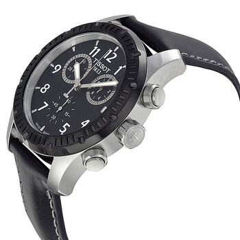Silver-tone stainless steel case with a black leather strap. Fixed black stainless steel bezel. Black dial with luminous hands and index hour markers. Arabic numerals mark the 4, 8 and 12 o'clock positions. minute markers around the outer rim. Dial Type: Analog. Luminescent hands and markers. Date display at the 3 o'clock position. Chronograph - three sub-dials displaying: 60 second, 30 minute and 1/10th of a second. ETA Caliber G10.211 quartz movement. Scratch resistant sapphire crystal. Pull / push crown. Solid case back. Round case shape, case size: 42.5 mm, case thickness: 11 mm. Band width: 18 mm. Tang clasp. Water resistant at 100 meters / 330 feet. Functions: chronograph, date, hour, minute, second. Sport watch style. Watch label: Swiss Made. Tissot V8 Chronograph Black Dial Black Leather Men's Watch T0394172605700.
