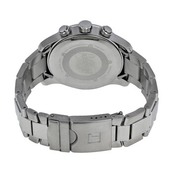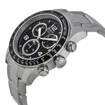 Stainless steel case with a stainless steel bracelet. Fixed stainless steel bezel with a black ion-plated top ring showing tachymeter markings. Black dial with luminous hands and index numeral hour markers. Arabic numerals mark the 4. 8 and 12 o'clock positions. Minute markers around the outer rim. Dial Type: Analog. Luminescent hands and markers. Date display at the 3 o'clock position. Chronograph - three sub-dials displaying: 1/10 second, 60 seconds and 30 minutes. Quartz movement. Scratch resistant sapphire crystal. Solid case back. Case diameter: 42.5 mm. Case thickness: 11.12 mm. Round case shape. Deployment clasp with a push button release. Water resistant at 100 meters / 330 feet. Functions: chronograph, tachymeter, date, hour, minute, second. Casual watch style. Watch label: Swiss Made. Tissot V8 Chronograph Black Dial Men's Watch T0394171105702.
