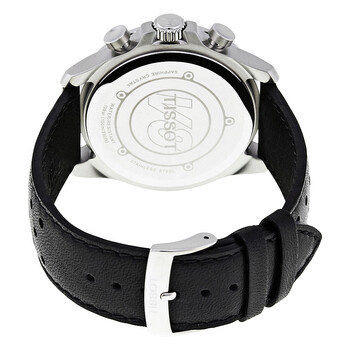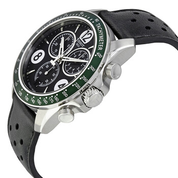 Stainless steel case with a black perforated leather strap. Fixed stainless steel bezel with a green aluminium top ring showing tachymeter markings. Black dial with luminous silver-tone hands and index hour markers. Arabic numerals mark the 4, 8 and 12 o'clock positions. Minute markers around the outer rim. Dial Type: Analog. Luminescent hands and markers. Date display at the 6 o'clock position. Chronograph - three sub-dials displaying: 60 second, 30 minute and 1/10th of a second. ETA G10.212 quartz movement. Scratch resistant sapphire crystal. Solid case back. Case size: 42.5 mm. Case thickness: 11 mm. Round case shape. Band width: 22 mm. Tang clasp. Water resistant at 100 meters / 330 feet. Functions: chronograph, tachymeter, date, hour, minute, second. Luxury watch style. Watch label: Swiss Made. Tissot V8 Chronograph Black Dial Men's Watch T106.417.16.057.00.
