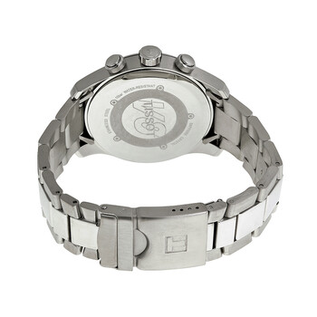 Stainless steel case with a stainless steel bracelet. Fixed stainless steel bezel. Silver dial with silver-tone hands and Arabic numeral hour markers. Minute markers around the outer rim. Dial Type: Analog. Date display at the 3 o'clock position. Chronograph - three sub-dials displaying: 60 second, 30 minute and 1/10th of a second. Quartz movement. Scratch resistant sapphire crystal. Solid case back. Case diameter: 42.5 mm. Case thickness: 11 mm. Round case shape. Band width: 20 mm. Folding clasp. Water resistant at 50 meters / 165 feet. Functions: chronograph, date, hour, minute, second. Casual watch style. Tissot V8 Chronograph Silver Dial Stainless Steel Men's Watch T0394171103700.
