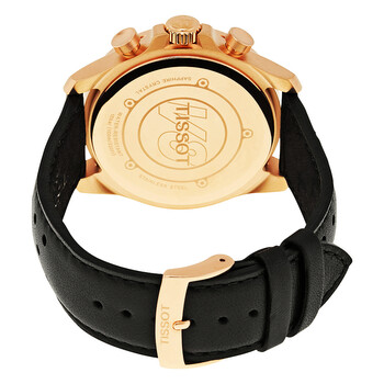 Rose gold PVD stainless steel case with a black microperforated leather strap. Fixed rose gold PVD bezel with a black aluminium top ring showing tachymeter markings. Silver dial with luminous rose gold-tone hands and index hour markers. Minute markers around the outer rim. Dial Type: Analog. Luminescent hands and markers. Date display at the 6 o'clock position. Chronograph - three sub-dials displaying: 60 second, 30 minute and 1/10th of a second. Quartz movement. Scratch resistant sapphire crystal. Screw down crown. Solid case back. Case size: 42.5 mm. Case thickness: 11.22 mm. Round case shape. Band width: 22 mm. Tang clasp. Water resistant at 100 meters / 330 feet. Functions: chronograph, tachymeter, date, hour, minute, second. Sport watch style. Watch label: Swiss Made. Tissot V8 Chronograph Silver Dial Men's Watch T106.417.36.031.00.