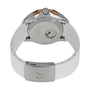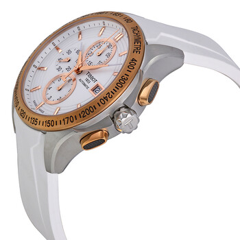 Stainless steel case with a white rubber strap. Gold PVD bezel showing tachymeter markings. White dial with gold-tone hands and index hour markers. Minute markers around the outer rim. Date display appears at the 3 o'clock position. Chronograph - three sub-dials displaying: 6 hours, 30 minutes and 60 seconds. Automatic movement with a 45-hour power reserve. Scratch resistant sapphire crystal. Solid case back. Case diameter: 44 mm. Case thickness: 15 mm. Deployment clasp with push-button release. Water resistant at 100 meters/ 330 feet. Functions: hours, minutes, seconds, calendar, chronograph, tachymeter. Tissot Veloci T Automatic Chronograph Men's Watch T024.427.27.011.00.