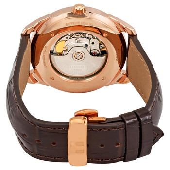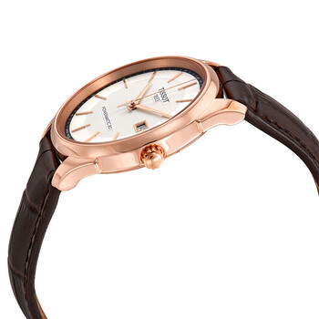 18kt rose gold case with a brown leather strap. Fixed gold-tone bezel. Silver-tone dial with rose gold-tone hands and index hour markers. Minute markers around the outer rim. Dial Type: Analog. Date display at the 3 o'clock position. Tissot Calibre Powermatic 80 (C07.111) automatic movement with an 80-hour power reserve. Scratch resistant sapphire crystal. Transparent case back. Round case shape, case size: 40 mm, case thickness: 9.3 mm. Band width: 20 mm. Buckle clasp. Water resistant at 30 meters / 100 feet. Functions: date, hour, minute, second. Luxury watch style. Watch label: Swiss Made. Tissot Vintage Powermatic Automatic 18kt Rose Gold Men's Watch T920.407.76.031.00.