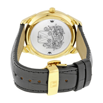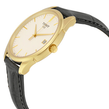 18kt gold case with a black leather strap. Fixed 18kt gold bezel. White dial with gold-tone hands and index hour markers. Minute markers around the outer rim. Dial Type: Analog. Date display at the 3 o'clock position. Quartz movement. Scratch resistant sapphire crystal. Solid case back. Case diameter: 40 mm. Case thickness: 7 mm. Round case shape. Butterfly clasp. Water resistant at 30 meters / 100 feet. Functions: date, hour, minute, second. Casual watch style. Watch label: Swiss Made. Tissot Vintage White Dial Black Leather Men's Watch T920.410.16.011.00.